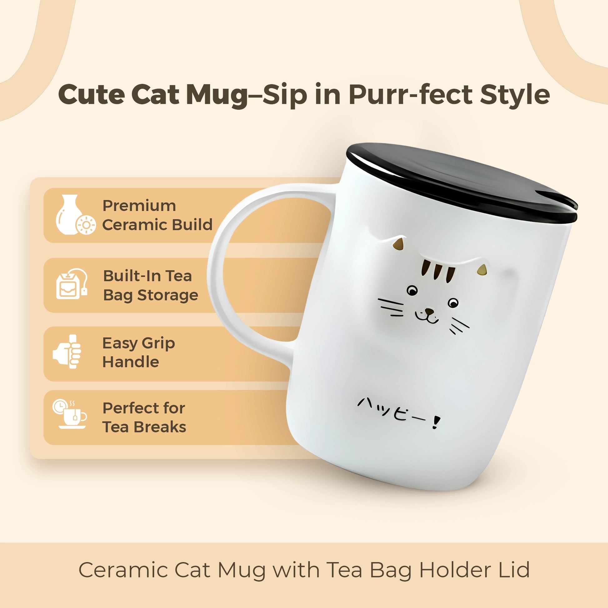 Enjoy your tea time like never before with our adorable CCat Mug with Tea Bag Holder Lid. Designed with charming 3-D cat features and a smooth, fine detailing, this mug adds a touch of warmth to every sip. The built-in tea bag holder lid keeps your tea ritual neat and convenient, making it perfect for home and office tea breaks. Crafted from premium ceramic, it offers durability, comfort, and a delightful drinking experience you can enjoy for years. Ideal for daily utility or gifting, this cute cat cup is a must-have for tea lovers and animal fans alike.